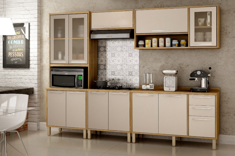Cozinha Modulada Paris Com Três Portas Com Vidro 5 Peças-Sallêto Móveis – Carvalho/Off White