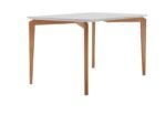 Mesa Roma 160×90 (Base Roma e Tampo MDF 18mm com Vidro Off), Côr Mel/Of White, da Sala Vip Móveis – Medidas: Alt 0,80m Larg 1,60m Prof 0,90m – Esturuta: Pés de Madeira Maciça de Eucalipto, Tampo de MDF 18mm com Bordas Chanfradas e Cantos Copo e Vidro 3mm Serigrafado Off White.