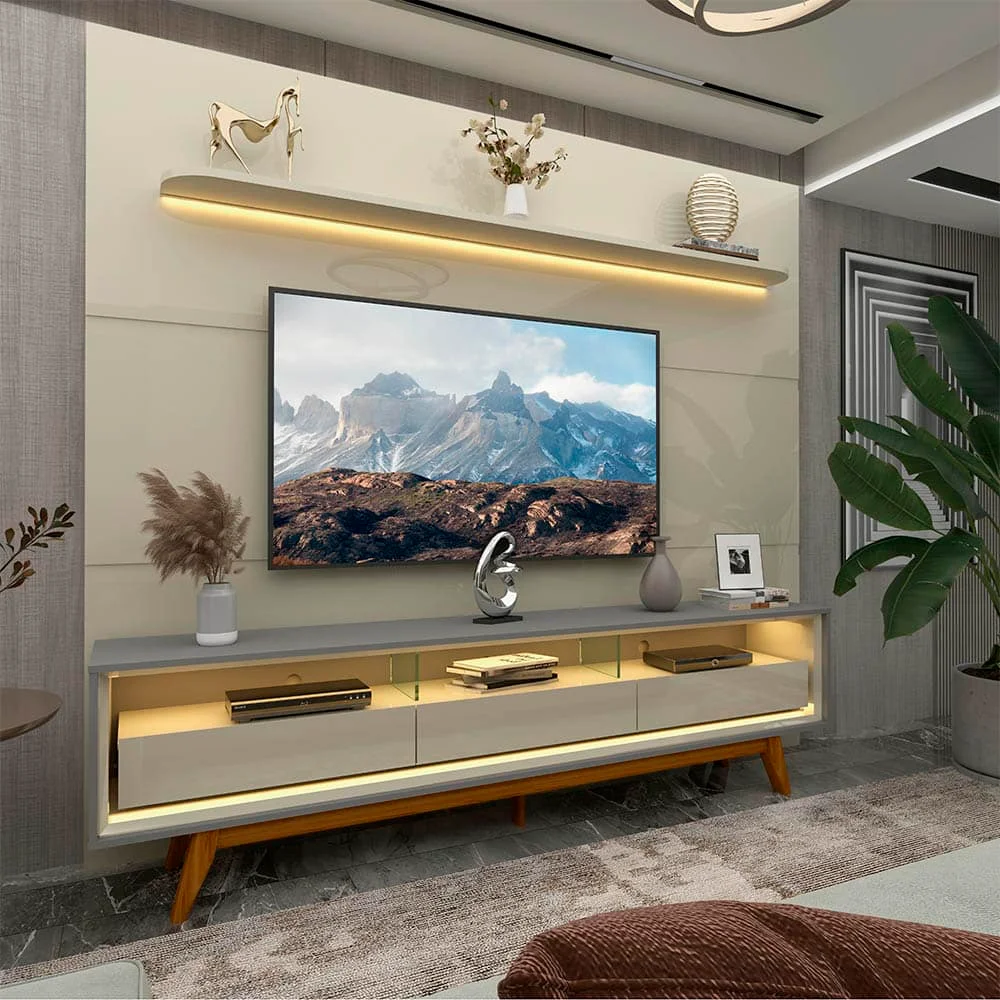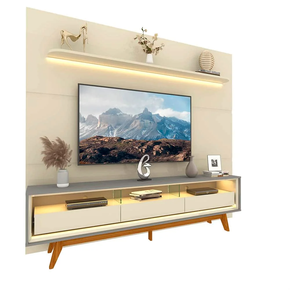 Painel Royal 220 Off White + Rack Requinte 212 Cinza/Off White – GELIUS