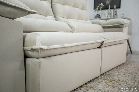 O assento é feito com percintas Italiana, molas bonnel e pillow preenchido com espuma D28 soft com 18cm de espessura. Além disso, as corrediças para movimentação do assento no abrir e fechar são em tubo de ferro, com isso a qualidade e acima de tudo, a durabilidade aumentam significativamente.